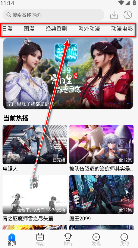 1、打开动漫屋最新版本纯净无广告版APP后,在首页顶部可以看到日漫、国漫、经典番剧以及动漫电影等不同分类栏目。