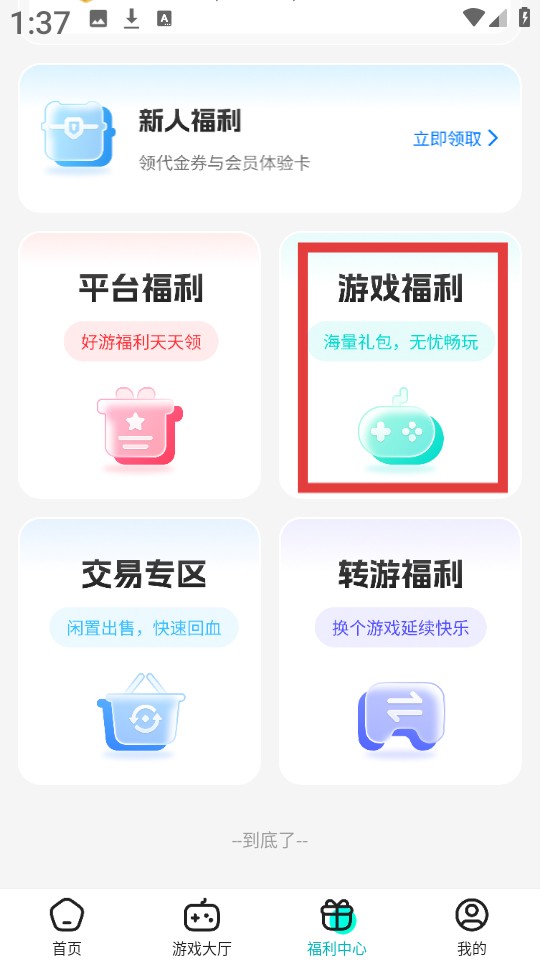 1、打开零玩游戏盒子最新版App后,点击底部导航栏中的“福利中心”。