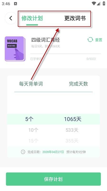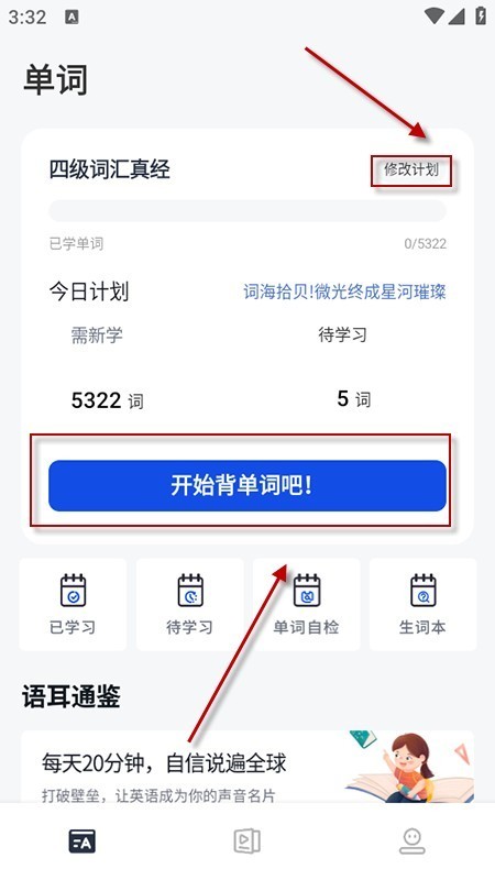 1、先在本站下载、安装并打开贝壳单词软件,进入首页后点击“修改计划”。根据自己的学习需求和时间安排,设置每天要背的新单词数量,还可以更换词书,选择最适合自己阶段的词库,让学习更高效。