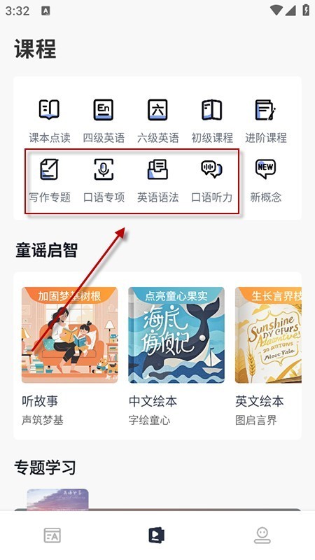 3、在“课程”板块,你可以挑选各种专项训练,比如“写作专题”“口语专项”“口语听力”,有针对性地提升不同英语能力。