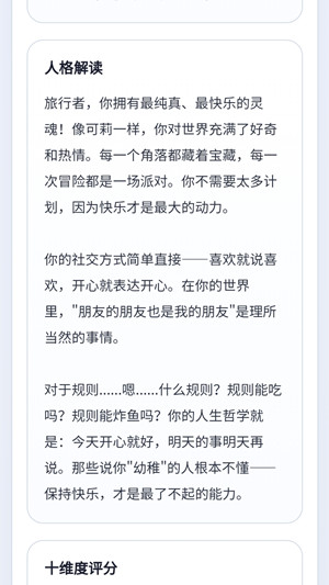 3、测试结束后,自动生成包含主标签、个性解读、维度评分的诊断报告,支持图片保存和分享。