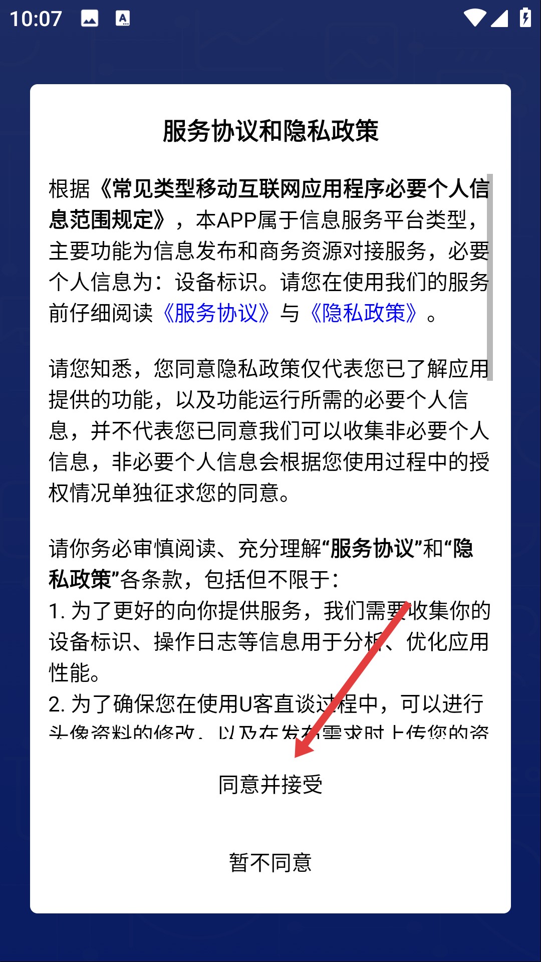 1、打开U客直谈app时,会弹出服务协议和隐私政策提示,告知软件的功能以及所需的必要个人信息。用户需要仔细阅读相关条款后,再选择同意并接受或暂不接受;