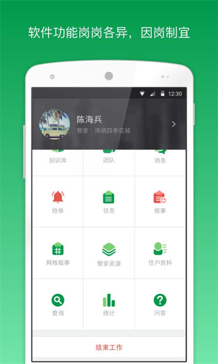 1、从考勤到任务,从投诉到维护,整个物业管理工作流程都在一个平台上完成。