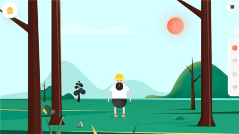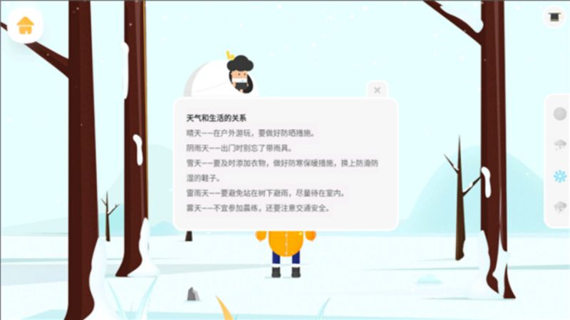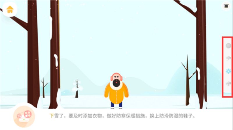 4、进入“气象万千”绘本场景后,我们会在右侧看到各种天气选项,点击对应天气就能切换场景,并有语音播报提示该天气下需要注意的事项;